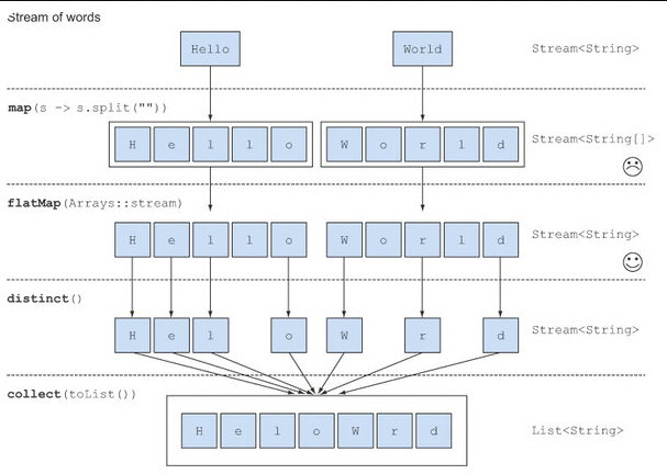 - map(Arrays::stream) 과 달리 faltMap은 하나의 평면화된 스트림을 반환한다.