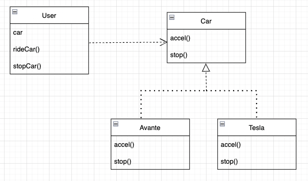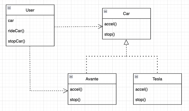 간단하게 아반떼 클래스와 사용자 클래스를 만들 수 있습니다. 코드상에서는 문제가 없어 보입니다. 하지만 '사용자는 테슬라를 운전한다'라고 요구사항이 변한다면? 또 '사용자는 제네시스를 운전한다' 등 다양하게 요구사항이 변화할 수 있습니다.