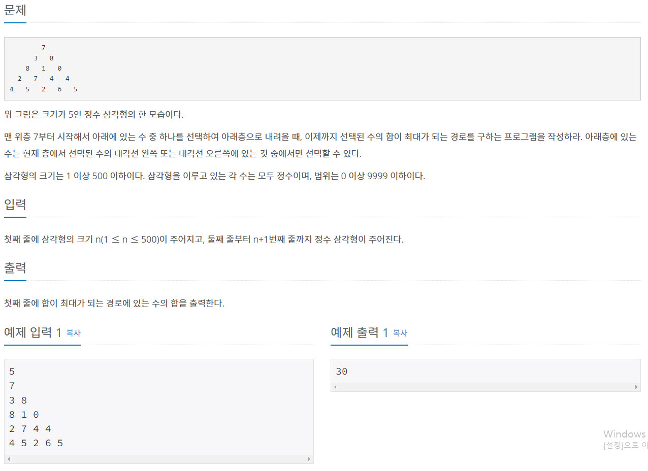 첫째 줄에 삼각형의 크기 n(1 ≤ n ≤ 500)이 주어지고, 둘째 줄부터 n+1번째 줄까지 정수 삼각형이 주어진다.