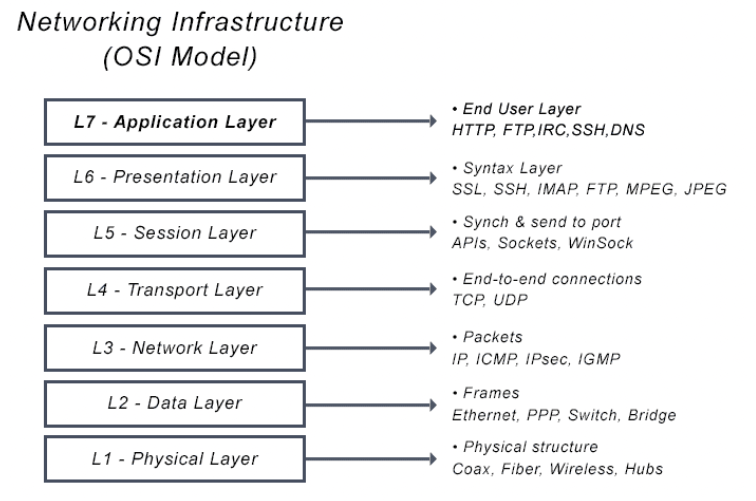 - 최종 사용자에게 가장 가까운 L7은 사용자 데이터와 직접 상호 작용하는 유일한 계층입니다. 이메일 클라이언트, 웹 브라우저 및 기타 소프트웨어 애플리케이션은 모두 레이어 7에 의존하여 통신을 시작합니다.
