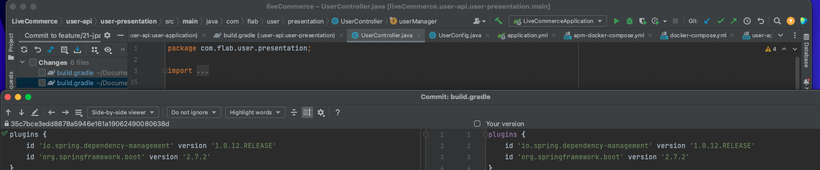 인텔리제이를 사용하다가 실수로 Show Diff in Separate 를 눌러서 commit change 창 이 아래와 같이 분리되었을 때