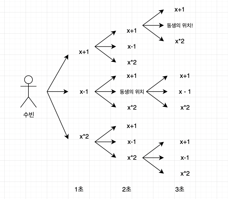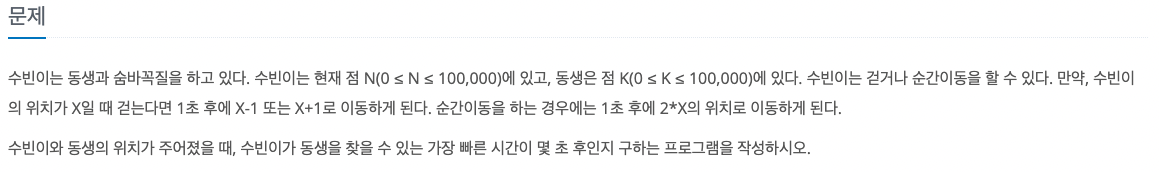 동생의 위치를 탐색해야 하니까 "그래프 탐색을 위한" 알고리즘 BFS/ DFS를 생각해 볼 수 있을 것 같습니다.