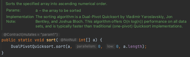 내부를 보면 Dual-Pivot Quicksort 를 사용한다고 적혀있습니다. 모든 데이터 셋에서 O(n log(n)) 을 보장하기 때문이라고 적혀있습니다.