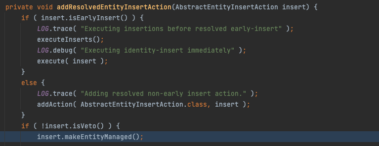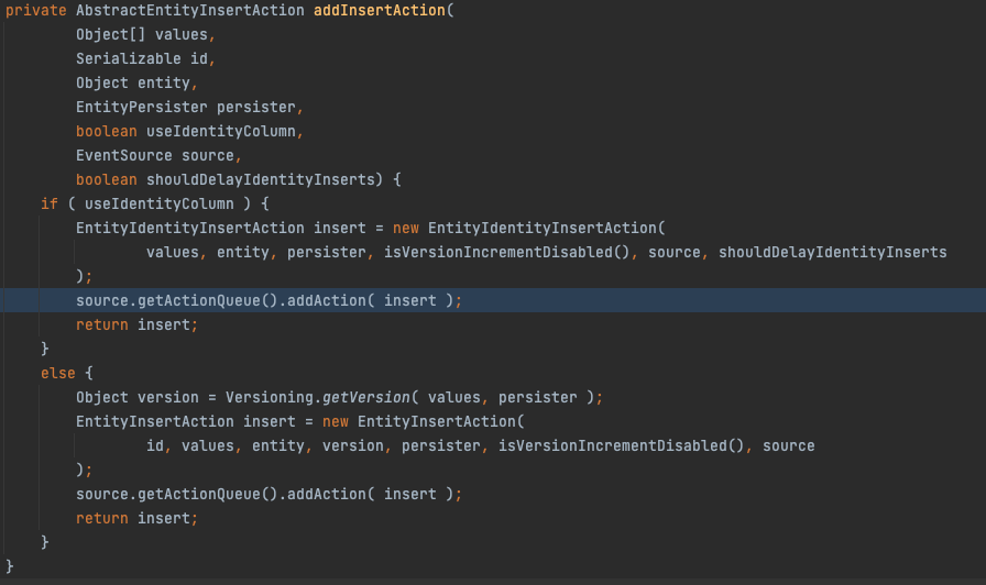 엔티티의 ID를 생성하여 저장합니다. 그 후에 이제 ActionQueue(쓰기지연저장소)에 쿼리를 저장을 하고 PersistContext에 엔티티를 등록합니다.