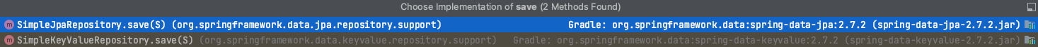 제가 만든 repository의 save 메서드를 들어가 보니 전에 설명한 CrudRepository 인터페이스가 보입니다 왼쪽 화살표를 눌러 구현체를 확인해 보면 아래와 같이 두 가지가 있습니다.