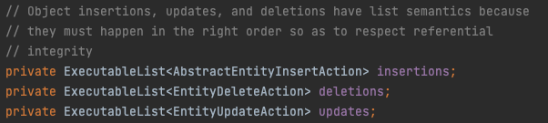 쿼리랑 직접적으로 관련된 필드가 눈에 들어오는데 ExecutableList 타입으로 선언이 되어있습니다. 또 위의 설명을 보니 insert, update, delete 가 올바른 순서대로 수행돼야 한다고 적혀있습니다. 어떻게 이를 보장해 줄까요? 아직 그 의문은 사라지지 않았습니다.