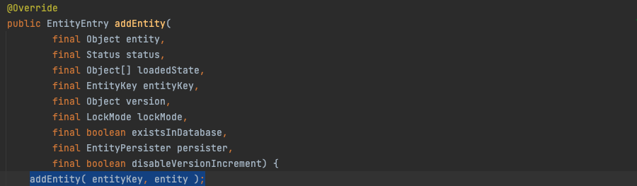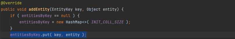 이제 어떻게 동작하고, 이루어져 있는지는 알겠는데 그래서 1차 캐시에는 언제, 어떻게 저장이 되는 것일까 궁금해집니다. StatefulPersistenceContext 클래스를 탐색하다보면 아래와 같은 메서드를 발견할 수 있습니다.