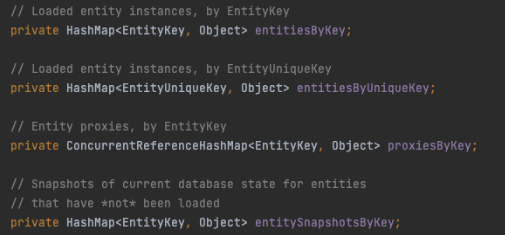 - 이 맵은 엔티티가 persistence context에 처음 로드될 때 엔티티의 원래 상태를 추적하는 데 사용됩니다.