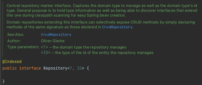 중앙 리포지토리 마커 인터페이스입니다. 관리할 도메인 유형과 도메인 유형의 ID 유형을 캡처합니다. 일반적인 목적은 유형 정보를 보유하고 클래스 경로 검색 중에 이 정보를 확장하는 인터페이스를 검색하여 스프링 빈을 쉽게 만드는 것입니다.