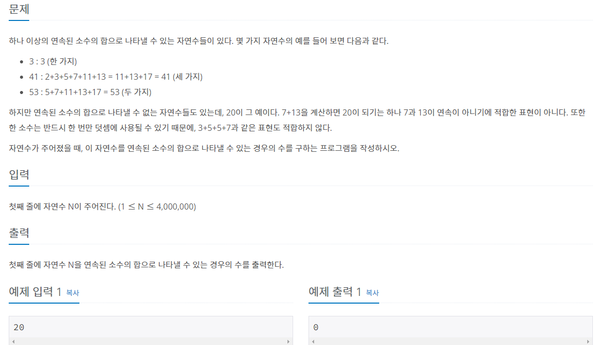 자연수가 주어졌을 때, 이 자연수를 연속된 소수의 합으로 나타낼 수 있는 경우의 수를 구하면 된다.