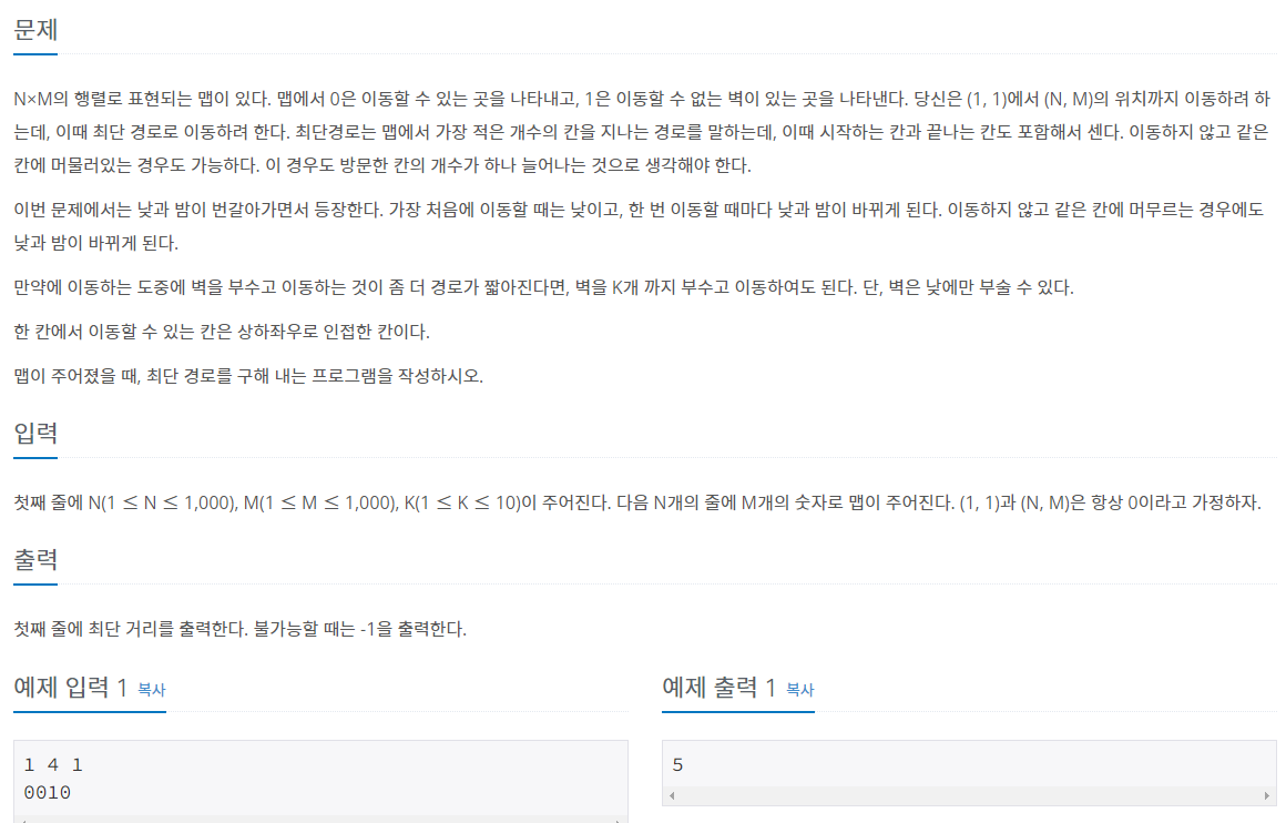 이동을 하거나 이동하지 않고 같은 칸에 머물러도 낮과 밤은 바뀐다. (이동하지 않아도 방문한 칸의 개수가 늘어나는것으로 처리) 벽을 부수고 이동하는 것이 경로가 더 빠르면 벽을 K개 부수고 이동할 수 있다. 단, 벽은 낮에만 부술 수 있다.