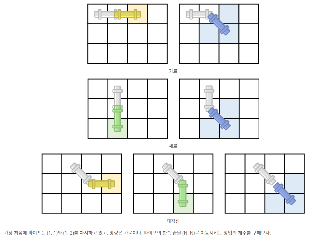 가로, 세로, 대각선 일 때 갈 수 있는 방향을 재귀함수를 사용해서 N, N 에 도달하면 방법의 개수를 증가시키고 return 을 시켜주면 답을 구할 수 있습니다. 다만 주의해야 할 점이 벽이있는 경우인데 가로 와 세로는 진행하는 방향에 벽이 있는지 없는지 확인하면 되지만 대각선의 방향에는 가로, 세로, 대각선 방향 모두 벽이 없어야합니다.