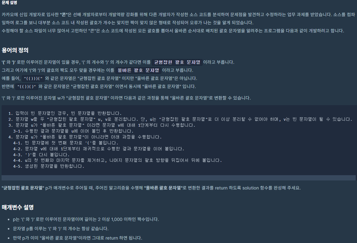 이 문제에 처음 접근할 때 2번 u, v 를 나누는 처리와 재귀의 처리가 좀 까다로웠다. 재귀는 그냥 진짜 문제에서 하라는대로 반환(return) 하면 되는 것이였고.. u,v 를 나눌 때 따로 ' ( ' 와 ' ) ' 개수가 같아질 때는 생각했는데 문자열을 나누고 만드는 부분이 미숙하였다. 카카오 문제를 풀면서 느낀건 내가 아직 문자열 문제에 많이 취약하다는 것을 느꼈다.