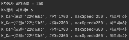 K_Car의 클래스변수는 '클래스이름.클래스변수'와 같은 방식으로 사용이 가능합니다. 인스턴스인 k3와 k5는 클래스 변수를 공통적으로 사용하기 때문에 k3의 최대 속도와 제로백을 변경해도 k5도 적용이 됩니다.