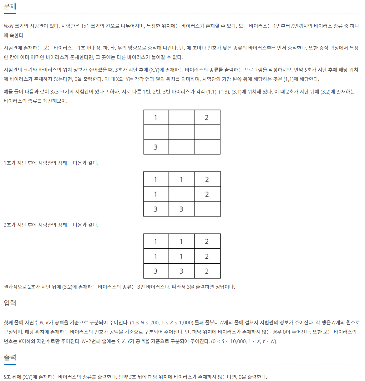 이코테 책뒤에 DFS&BFS 17번 문제로 나온 문제이기도 하다. 백준에서 정답률 28%로 낮은 정답률을 보유하고 있는데 요즘 스터디의 효과를 보는지 한번에 통과해서 기분이 좋았다. 아마 이 문제에서 접근하기 어려운점이 모든 바이러스는 1초마다 상, 하, 좌. 우 방향으로 증식하는데 바이러스는 매 초마다 낮은 종류의 바이러스가 증식하고 그 시점에 증식할 곳에 바이러스가 있으면 증식을 할 수 없다를 처리 하기가 까다로웠다고 생각을 합니다.