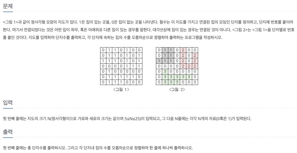 <그림 1>과 같이 정사각형 모양의 지도가 있다. 1은 집이 있는 곳을, 0은 집이 없는 곳을 나타낸다. 철수는 이 지도를 가지고 연결된 집의 모임인 단지를 정의하고, 단지에 번호를 붙이려 한다. 여