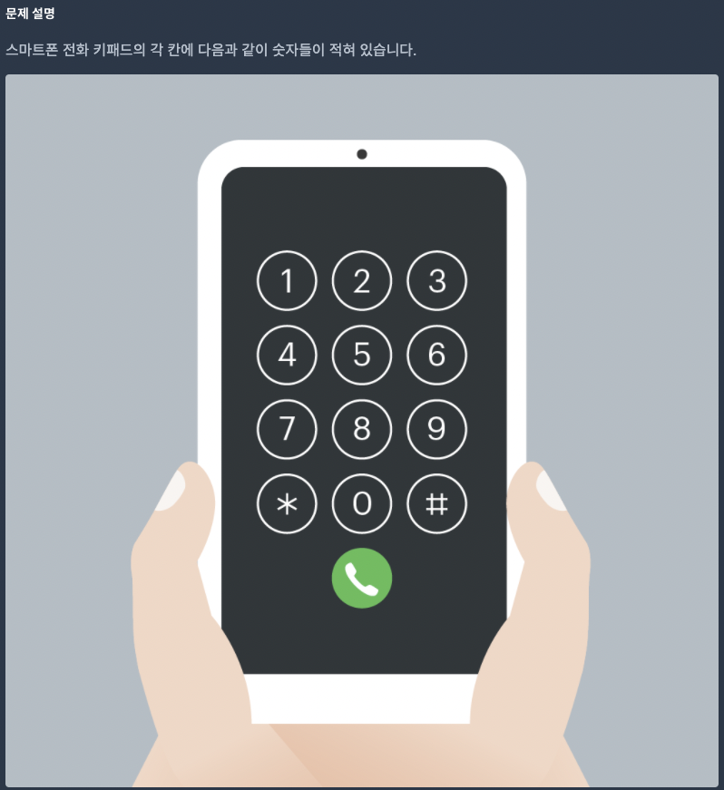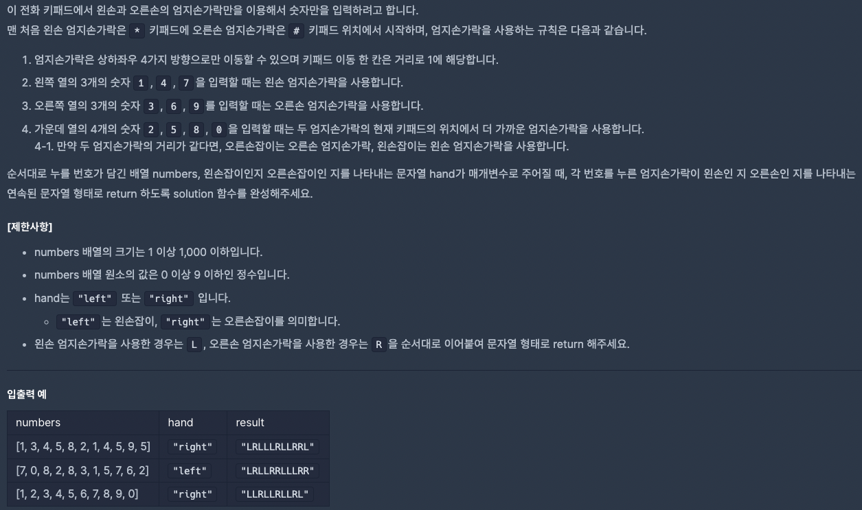 예전에 실력이 지금보다 부족할 때 상하좌우 4가지 방향에 이동 한 칸의 거리는 1이니까 bfs 문제인가? 라고 생각을 하고 풀어보려했지만 풀지 못한 기억이 있다. 왼손 오른손이 있고 2, 5 , 8, 0 을 누를때만 가까운 손이 누르도록 하고, 같으면 문제에 주어진 손으로 누르라고 지시하고 해서 그냥 단순 구현으로 해결할 수 있다.