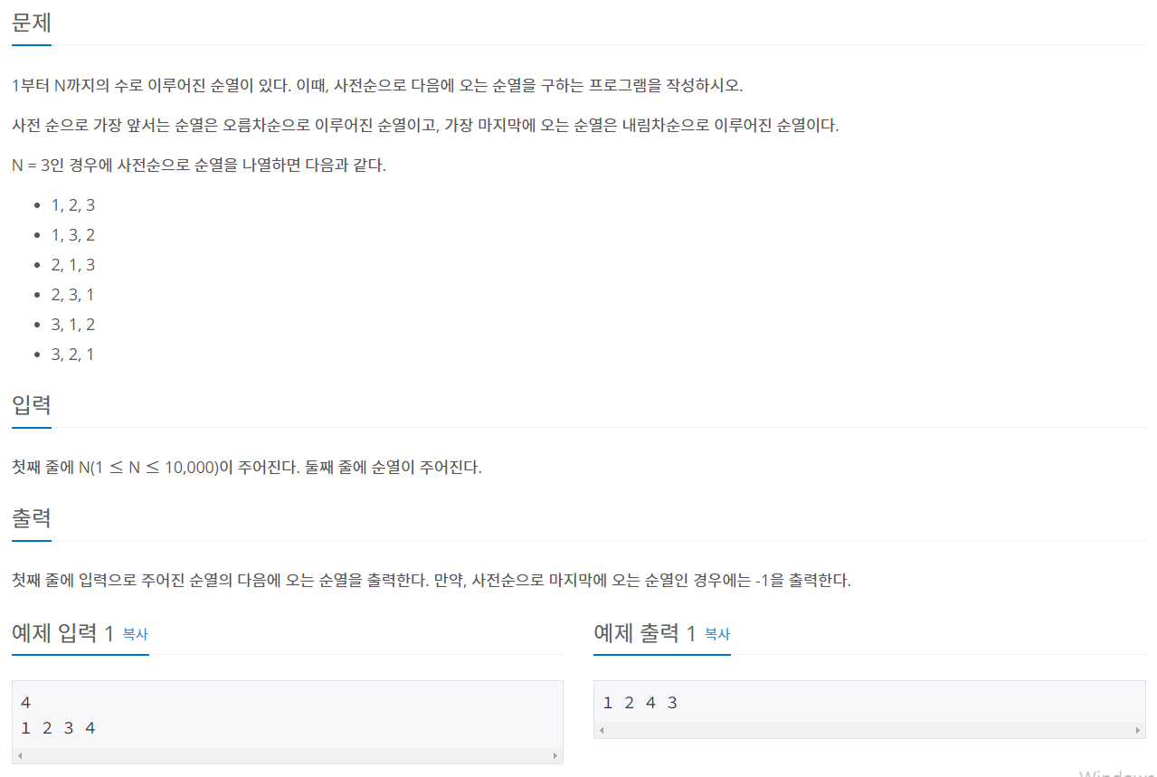 첫째 줄에 입력으로 주어진 순열의 다음에 오는 순열을 출력한다. 만약, 사전순으로 마지막에 오는 순열인 경우에는 -1을 출력한다.