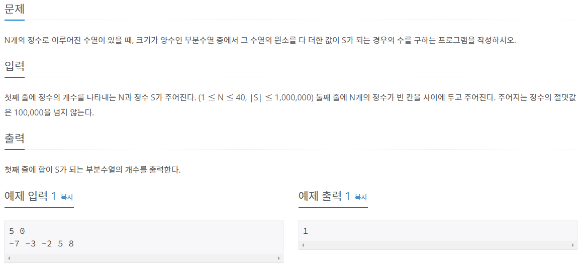 백준 부분수열의 합 이라는 문제와 같지만 N제한이 최대 40이다.
