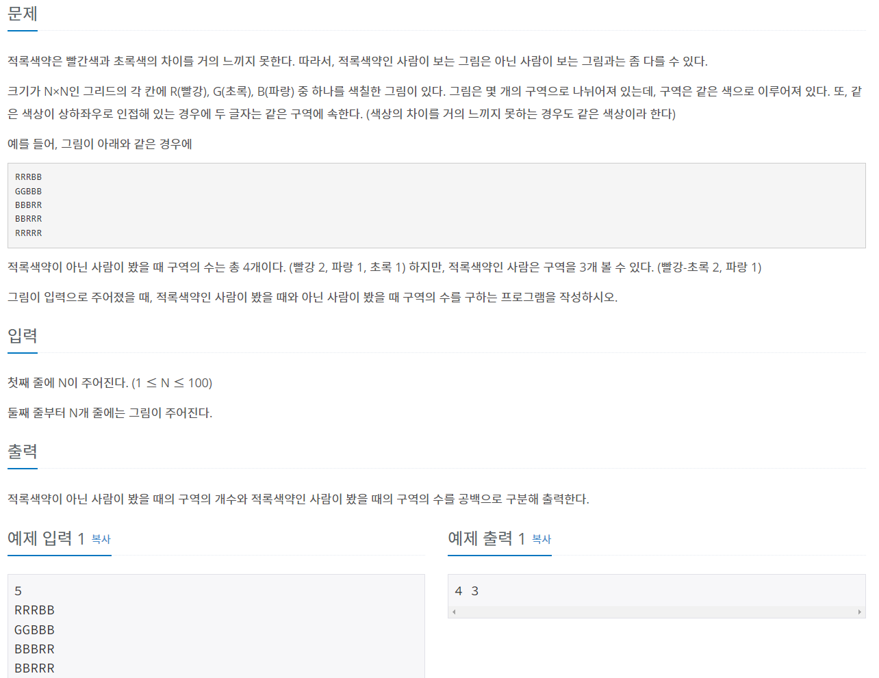 적록색약은 빨간색과 초록색의 차이를 거의 느끼지 못한다. 따라서, 적록색약인 사람이 보는 그림은 아닌 사람이 보는 그림과는 좀 다를 수 있다. 크기가 N×N인 그리드의 각 칸에 R(빨강), G(초록)