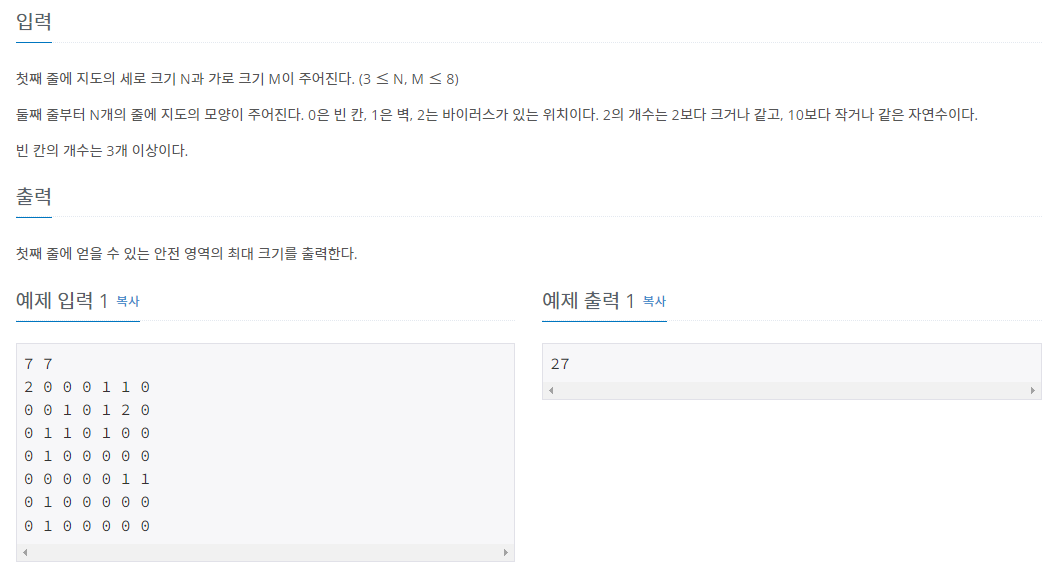 1. 연구소 모든 칸에 벽을 세우려면 빈칸인지 확인을 하고 벽을 세워야 하기 때문에 dfs 방식으로 해결 할 수 있다.