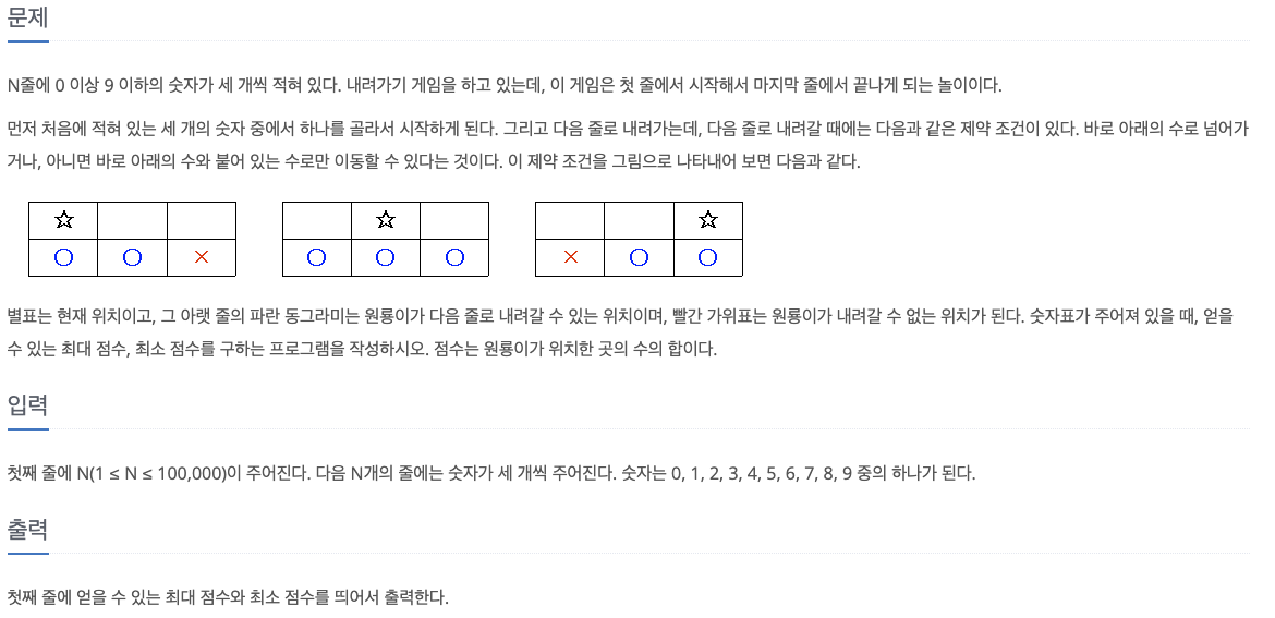 항상 세줄씩 주어지기 때문에 d[i][0] , d[i][1], d[i][2] 인 경우로 나눠서 구한다. 그리고 점화식에 의해 d[i-1][0], d[i-1][1], d[i-1][2] 또한 최대, 최소 값을 항상 가져야한다. 그러면 하나만 예를들어 왼쪽 0 인경우 d[i][0] 인 경우는 d[i-1][0], d[i-1][1] 에서 내려왔을 텐데 둘중 최대, 최소값을 가져가도록 하고 현재 위치의 값을 더해서 구현을 하면 된다.