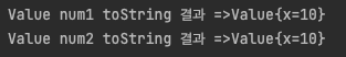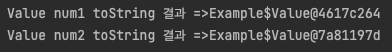 오버라이딩을 사용하지 않으면 실제로 Value클래스의 16진수 해시값을 반환하는 결과를 얻게 됩니다.