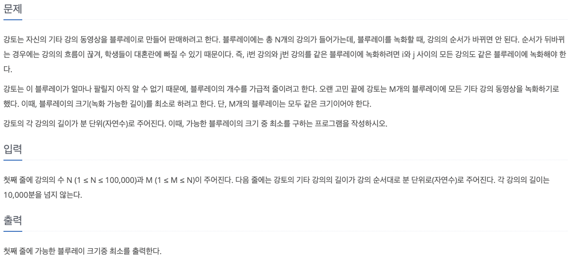 그런데 보통 이분탐색은 정렬된 곳에서 찾는게 보통인데 해당 문제에서는 강의의 순서가 뒤바 뀌면 안된다 라고 적혀있다. 따라서 정렬을 하지 않고 블루레이의 길이에 따라 만들어지는 강의의 수를 체크하여 가장 최소의 길이가 되는 블루레이 크기를 구해야한다.